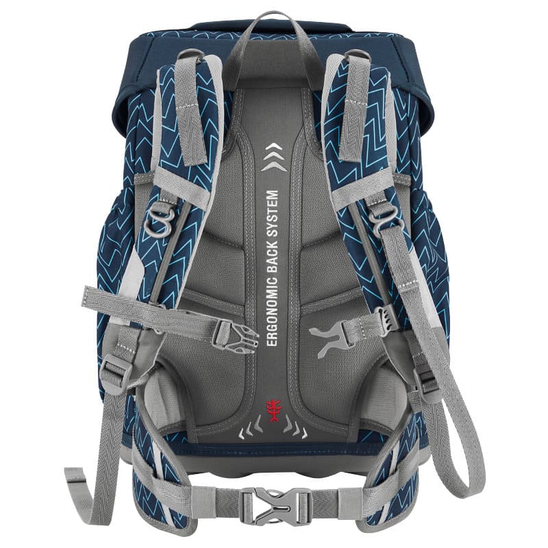 Der höhenverstellbare, abnehmbare Brustgurt und der abnehmbare Hüftgurt helfen das Gewicht von den Schultern auf den ganzen Körper zu verteilen. Die Lageverstellriemen sorgen für eine zentrale Platzierung auf dem Rücken. Der Ranzen läßt durch seine Gurte und die optimale Einstellung perfekt zum Bus sprinten. Ranzen auf, Gurte nachziehen und auf geht`s.