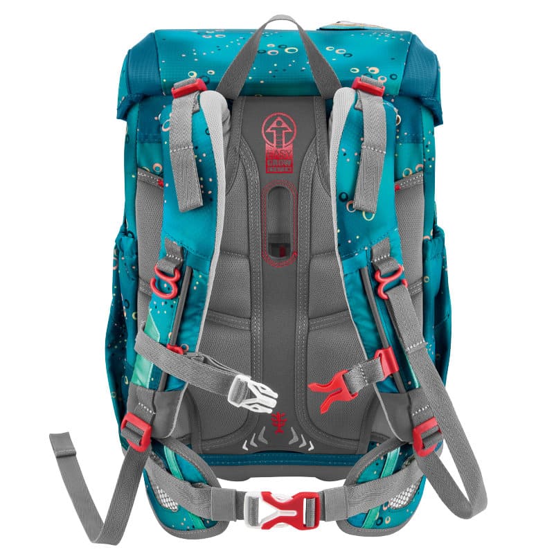 durch das patentierte Easy Grow System kann mit einem Drehgriff im Inneren des Space die Höhe der Schulträger und damit die Rückenlänge des Ranzen unkompliziert und individuell angepaßt werden. Der Cloud kann von einem besonders zierlichen, kleinen Schulkind getragen werden.