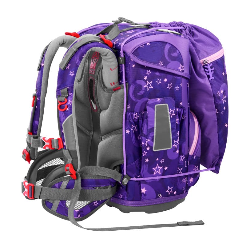 Der höhenverstellbare, abnehmbare Brustgurt und der abnehmbare Hüftgurt helfen das Gewicht von den Schultern auf den ganzen Körper zu verteilen. Die Lageverstellriemen sorgen für eine zentrale Platzierung auf dem Rücken. Der Ranzen läßt durch seine Gurte und die optimale Einstellung perfekt zum Bus sprinten. Ranzen auf, Gurte nachziehen und auf geht`s.