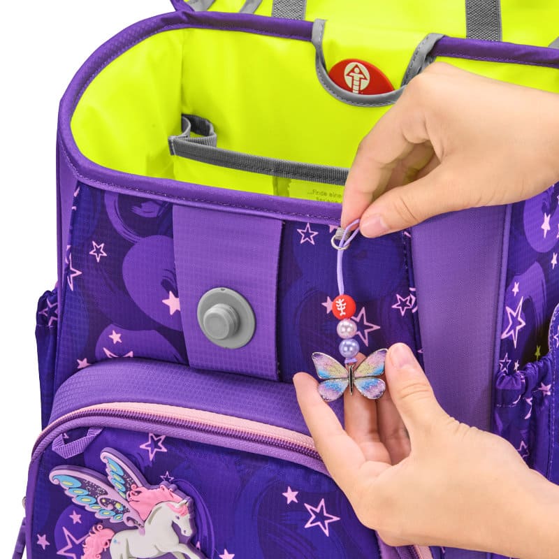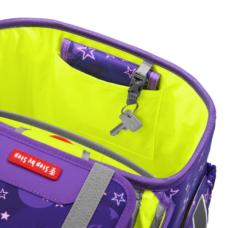 Das große Hauptfach mit integriertem Bücherfach, die nach außen wachsenden Front- und Seitentaschen ermöglichen ein Verstauvolumen von 19 Litern. Die Vordertasche ist isoliert mit Auslaufösen und ideal für das Pausenbrot und hält das Obst den ganzen Tag über frisch. Das Mäppchen wird mit Laschen platzsparend im Deckel des Ranzens verstaut. Auch der Stundenplan findet in diesem leicht und doch geräumigen Ranzen seinen Platz im Deckel.