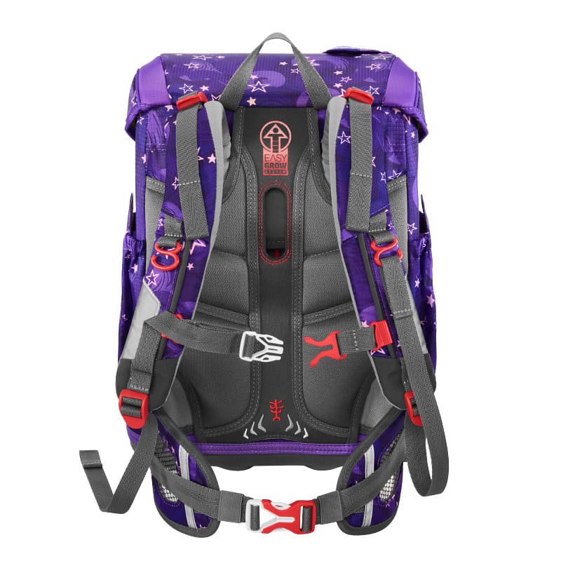 durch das patentierte Easy Grow System kann mit einem Drehgriff im Inneren des Space die Höhe der Schulträger und damit die Rückenlänge des Ranzen unkompliziert und individuell angepaßt werden. Der Cloud kann von einem besonders zierlichen, kleinen Schulkind getragen werden.
