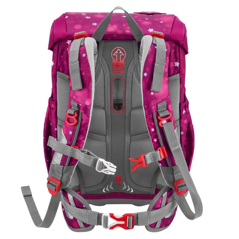 durch das patentierte Easy Grow System kann mit einem Drehgriff im Inneren des Space die Höhe der Schulträger und damit die Rückenlänge des Ranzen unkompliziert und individuell angepaßt werden. Der Cloud kann von einem besonders zierlichen, kleinen Schulkind getragen werden.