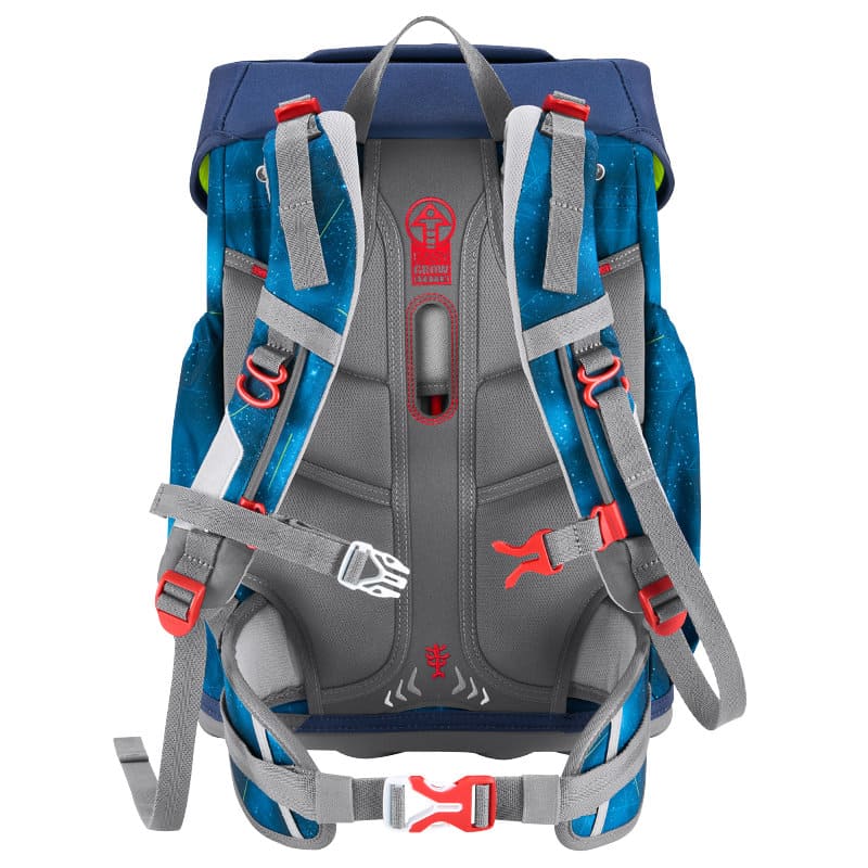 Der höhenverstellbare, abnehmbare Brustgurt und der abnehmbare Hüftgurt helfen das Gewicht von den Schultern auf den ganzen Körper zu verteilen. Die Lageverstellriemen sorgen für eine zentrale Platzierung auf dem Rücken. Der Ranzen läßt durch seine Gurte und die optimale Einstellung perfekt zum Bus sprinten. Ranzen auf, Gurte nachziehen und auf geht`s.