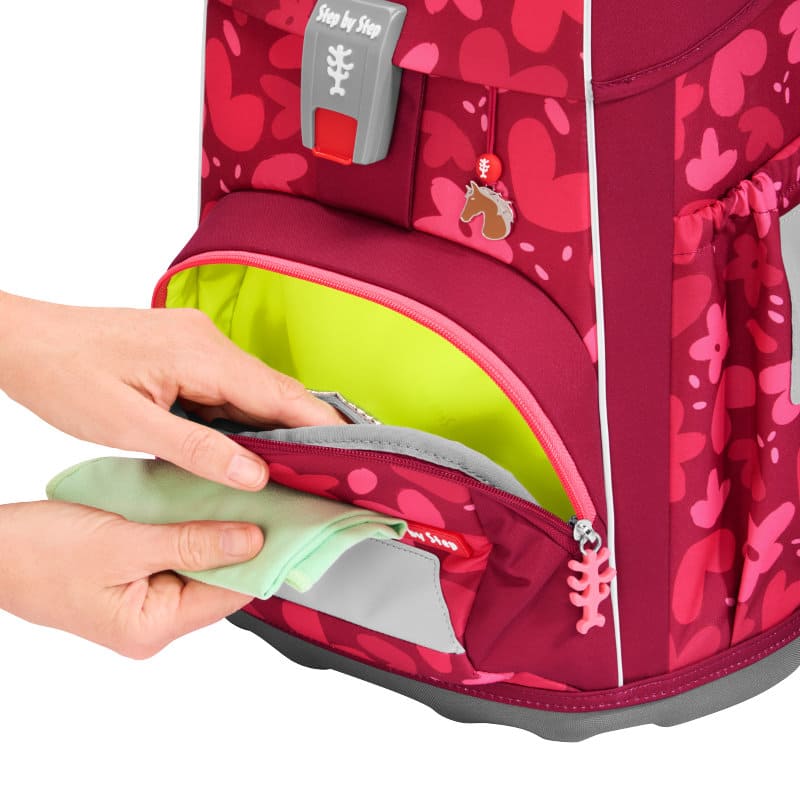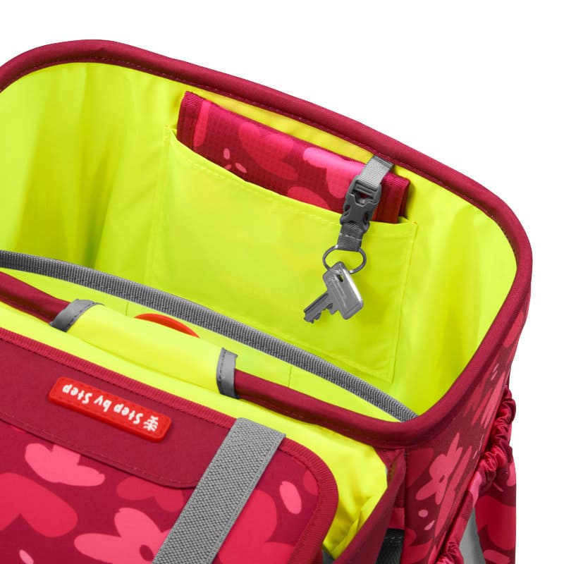Größe ist das Aushängeschild dieses Ranzen. Das große Hauptfach mit Extra Bücherfach, die nach außen wachsenden Seitentaschen mit Gummizug ermöglichen ein Verstauvolumen von 23 Litern. Die Vordertasche ist ebenfalls nach außen wachsend, isoliert und auslaufsicher und damit ideal für das Pausenbrot und frisches Obst. Das Mäppchen wird platzsparend im Deckel des Ranzens verstaut.