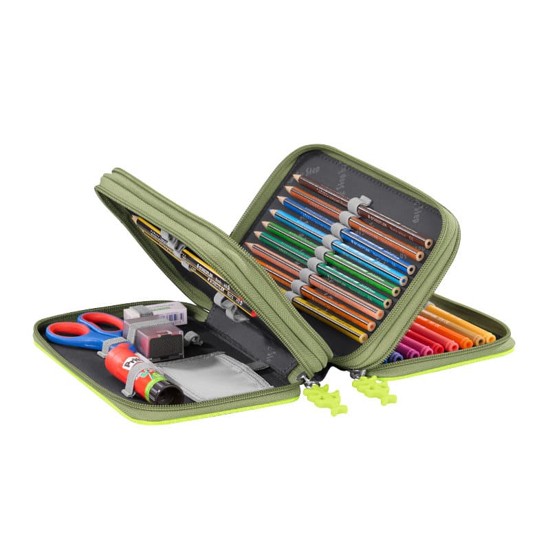 mit seinen 3 geräumigen Fächern beinhaltet alles, was das Schulkind zum Schreiben, Zeichnen, Malen und sogar Basteln  braucht.