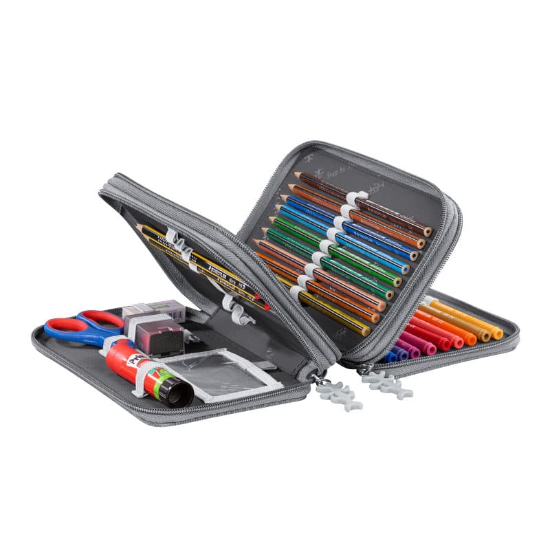 mit seinen 3 geräumigen Fächern beinhaltet alles, was das Schulkind zum Schreiben, Zeichnen, Malen und sogar Basteln  braucht.